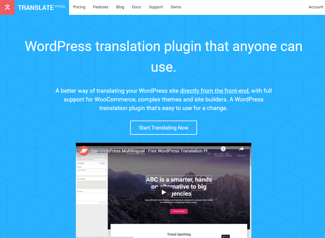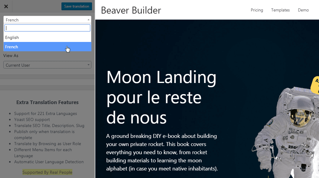 TranslatePress is a free multilingual WordPress plugin that uses a frontend visual translation interface similar to Beaver Builder, so you can see the translated material right on the page as you work. This makes it easier to use than other multilingual solutions, where the translation process happens in the backend.