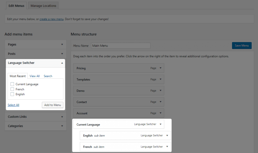 If you want to add the language switcher to the navigation menu, go to Appearance > Menus and add the languages you’ve translated your site into to the bottom of the menu. It’s best to add the Current Language item first, then add your languages as sub-items.