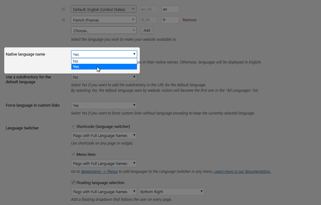 There are also three different ways you can showcase the language switcher itself. The button you see at the bottom of your page is the “floating language switcher.” You can change its position to the bottom left, top left or top right. You can also deselect this version to deactivate it if you’d prefer to use another switcher and don’t want to use them simultaneously.