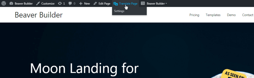 If you’re logged into your backend, you should see the WordPress admin bar at the top of every page or your site that you view. Simply navigate to any page you want to translate and click the Translate Page menu item in the admin bar.