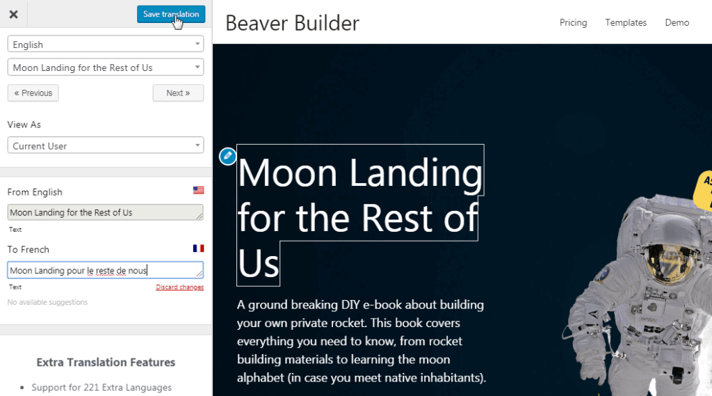 This opens the translation options in the left panel, shown in the following screenshot. Enter the translation for the selected text. Click Save Translation to save that text string.