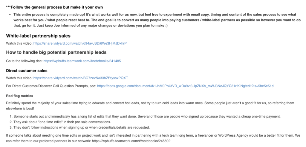Here’s some of our documentation around how we handle sales at WP Buffs. As you can see, it’s a nice mix of text and videos.