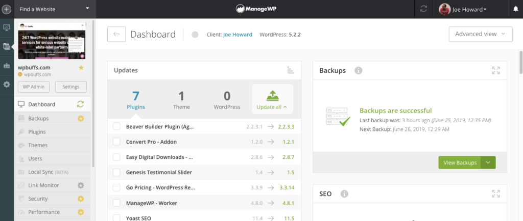 Two of our favorite tools for the job are ManageWP and BlogVault. These tools allow you to manage plugin, theme and core file updates, security and performance scans, 24/7 uptime monitoring, track Google Analytics, report on WooCommerce transactions and much, much more.
