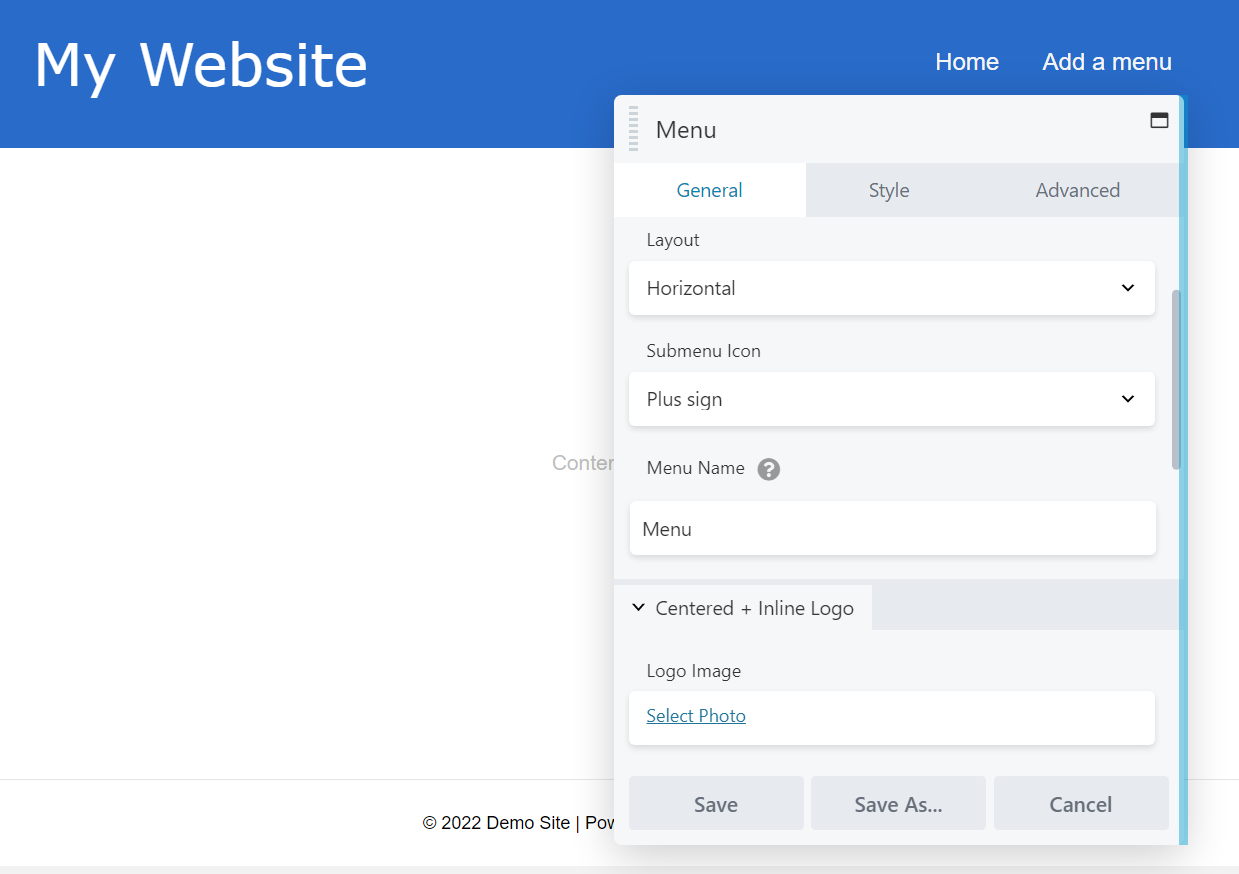 Every element in the header layout corresponds to a Beaver Builder module. For instance, if you select the Menu element, Beaver Builder will let you choose from existing menus on your site, change their orientation, use an accordion, add a logo, and more: