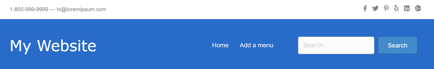 The default header template includes two rows — one with contact information and links to social media and the other with space for your website title and main navigation menu.