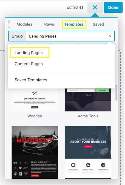 If you already have a structure for your landing page in mind, you’re ready to start dragging and dropping and can skip down to Step 3. To browse our templates, open the Content Panel and click the Templates tab, then click on the Group field and choose Landing Pages: