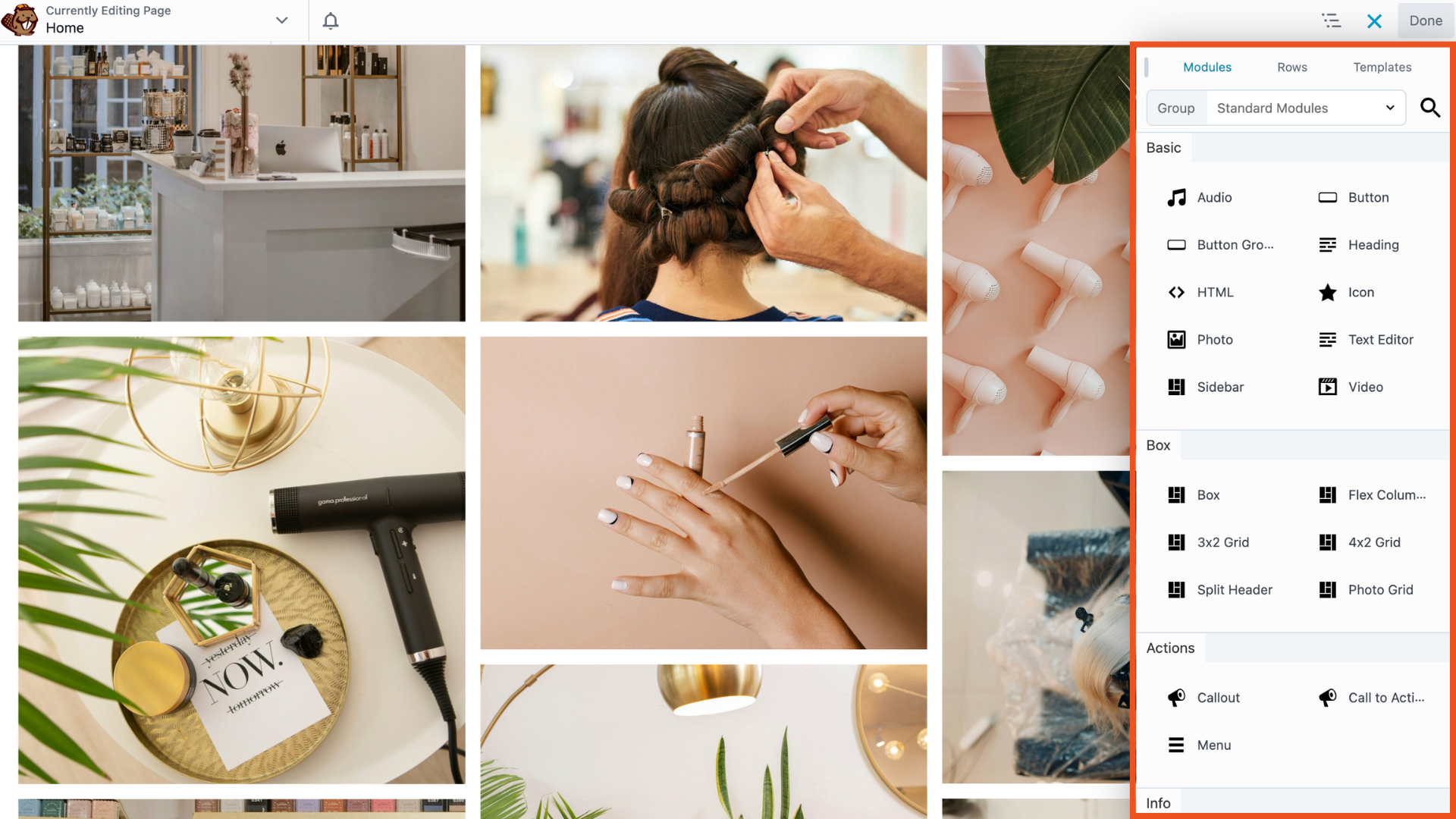 You can browse through the palette using the Modules, Rows, Templates, and Saved tabs at the top of the window. Each includes prebuilt elements you can use on your landing page.