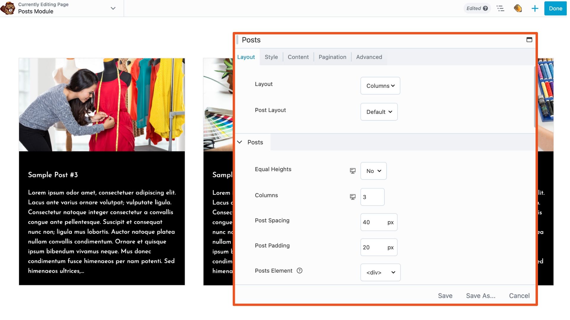 The Posts Module comes with Beaver Builder core. It helps users quickly display blog posts, pages, or custom post types with minimal effort. It includes basic styling options and layout presets that cover most standard content needs: