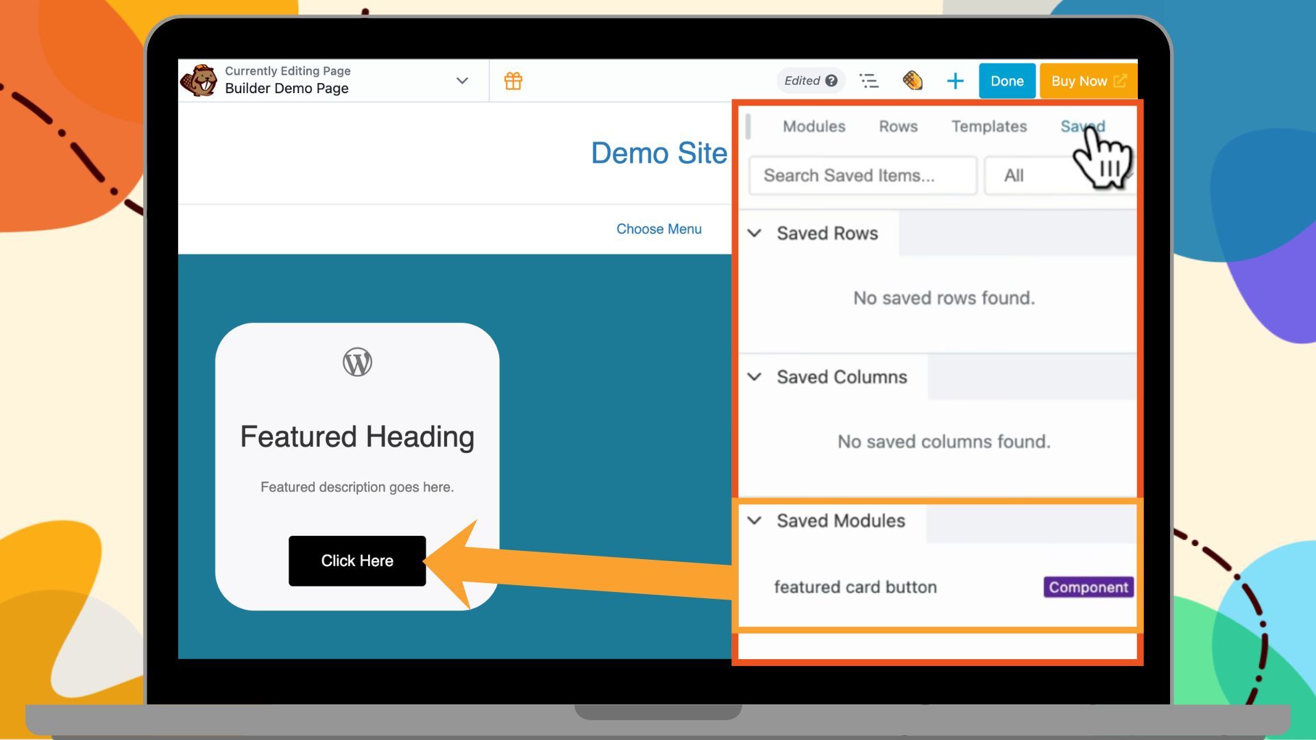 Now, instead of adding a regular button module, go to the Saved tab in the settings panel and drag your Button Component into the layout. Your card now contains a nested component: