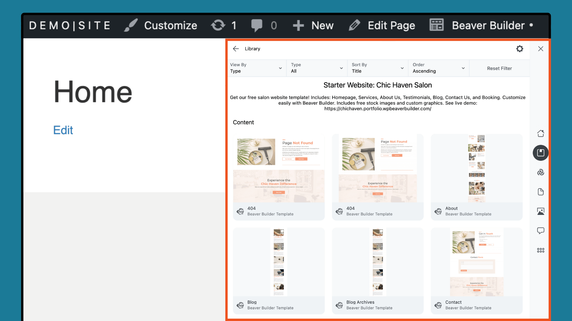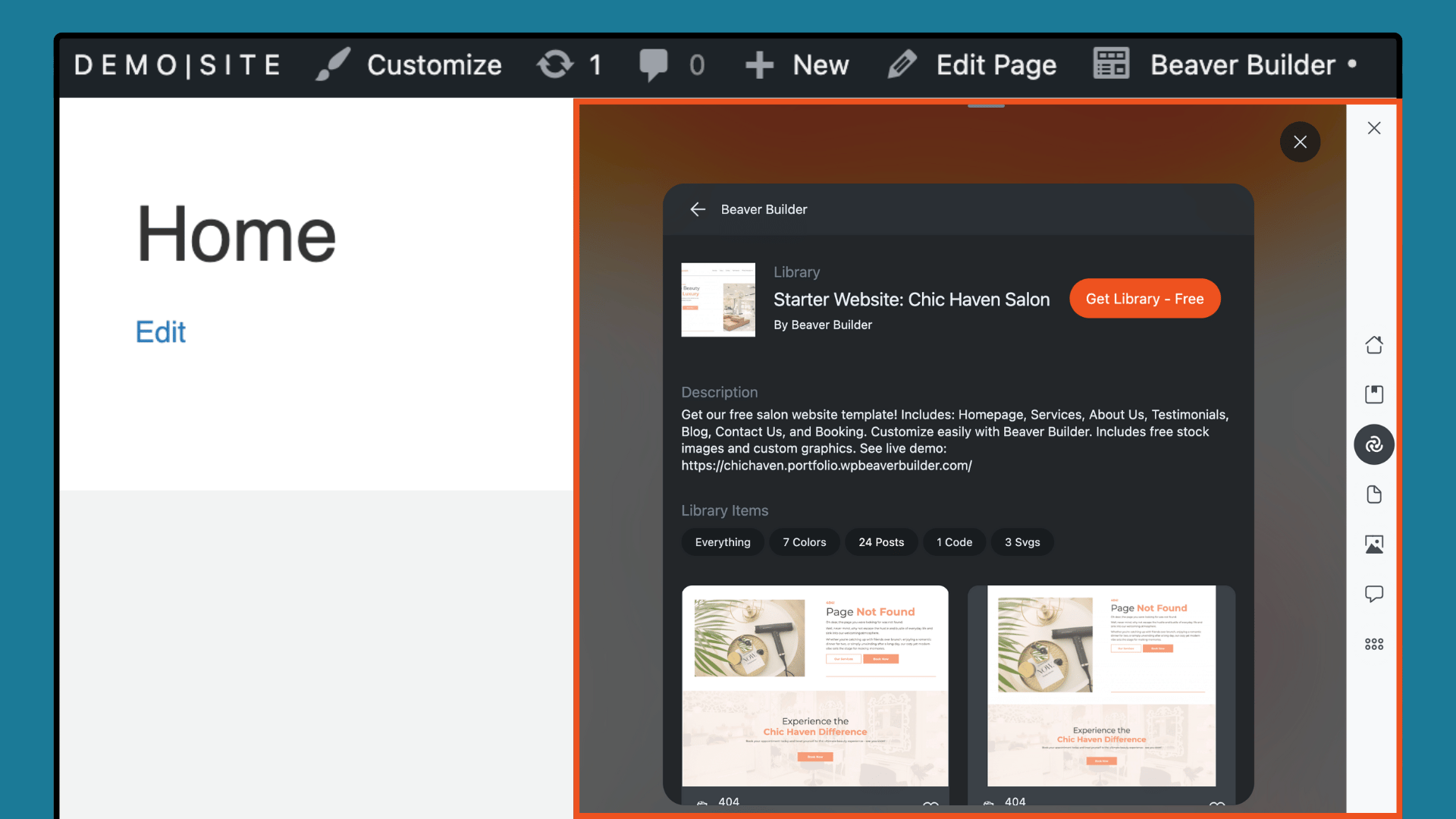 Once logged in, click on the Beaver Builder icon and look for the Chic Haven Salon Library. Click the “Get Library – Free” button: