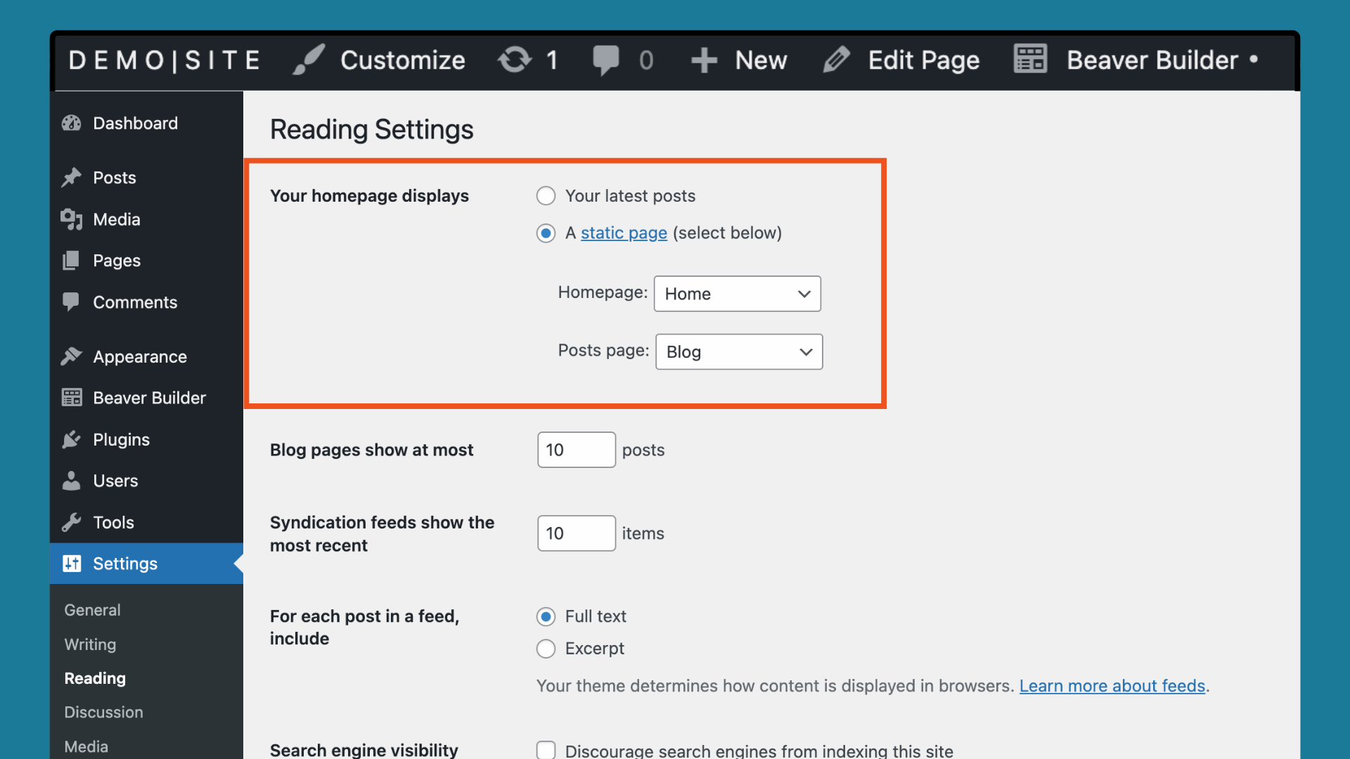 Next, set up your home and post pages through your WordPress dashboard. Just go to SETTINGS > READING and choose your preferred pages: