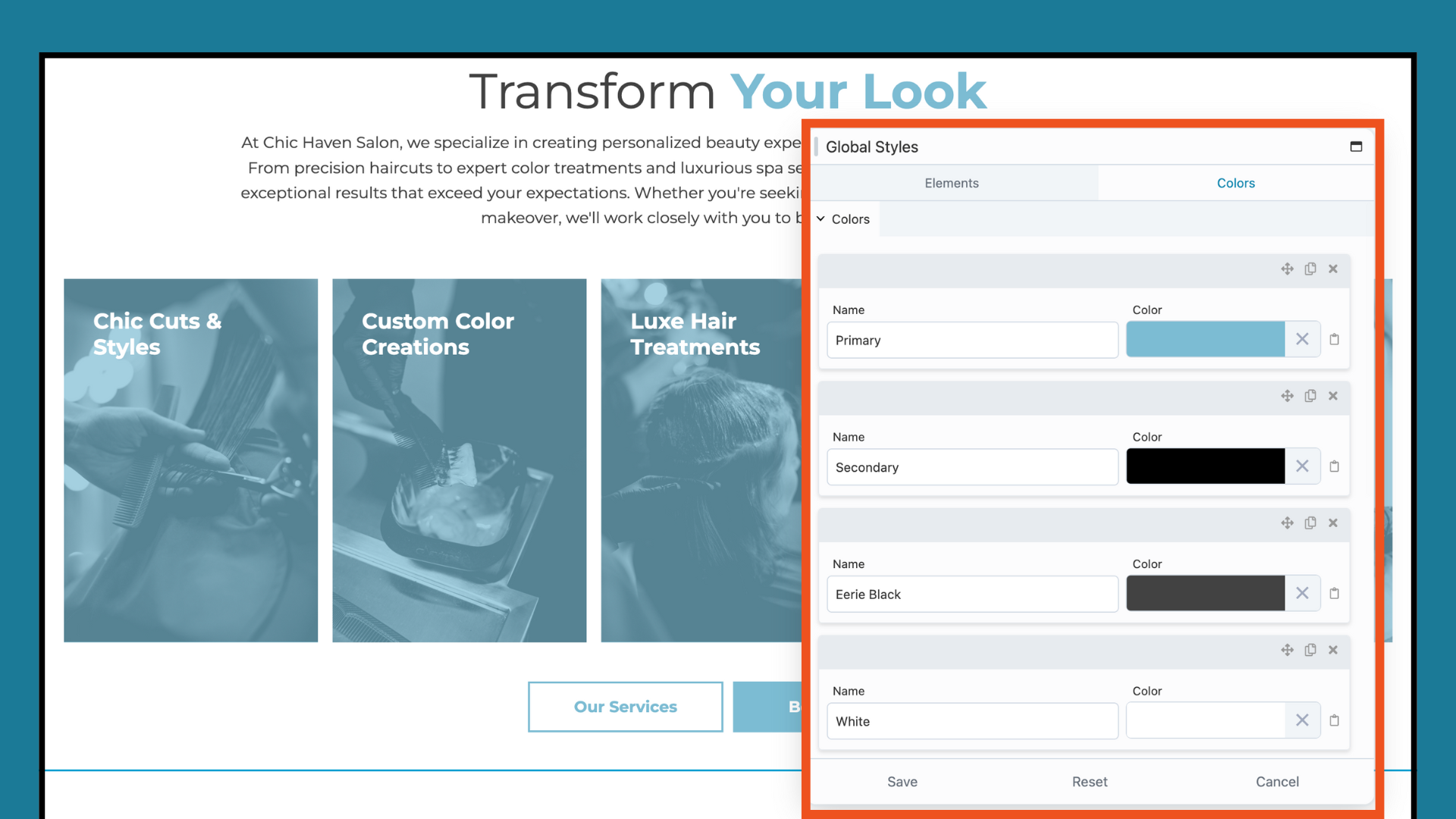 The Chic Haven Salon templates make use of Beaver Builder’s Global Styles and Settings, so you can easily tweak typography and brand colors. Simply adjust the Global Styles to fit your brand: