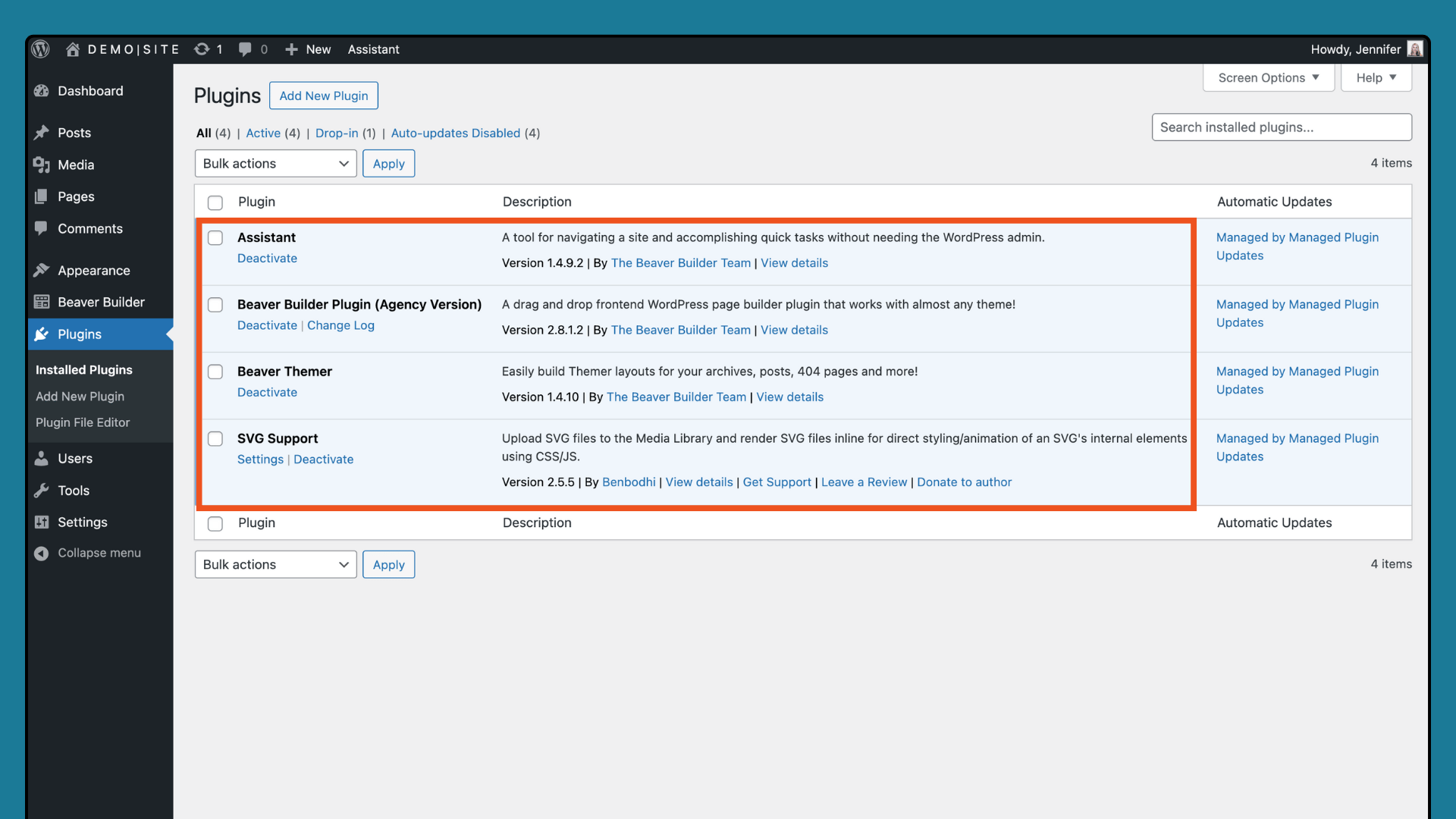 Now you are ready to add the following required plugins: Beaver Builder page builderBeaver Themer, Assistant, and SVG Support (recommended):