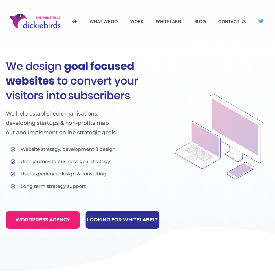 Goal focused website strategy & websites to convert your visitors into customers, subscribers, followers & fans. We help established organisations, developing startups & non-profits map out and implement online strategic goals. Dickiebirds also offer white-label Beaver Builder web design & development to agencies & designers.