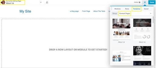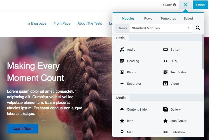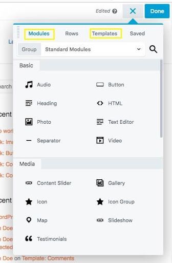In order to access all the helpful Beaver Builder tools, click the plus (+) sign in the upper right-hand corner of the screen. This reveals a palette of options, including Modules and Templates: