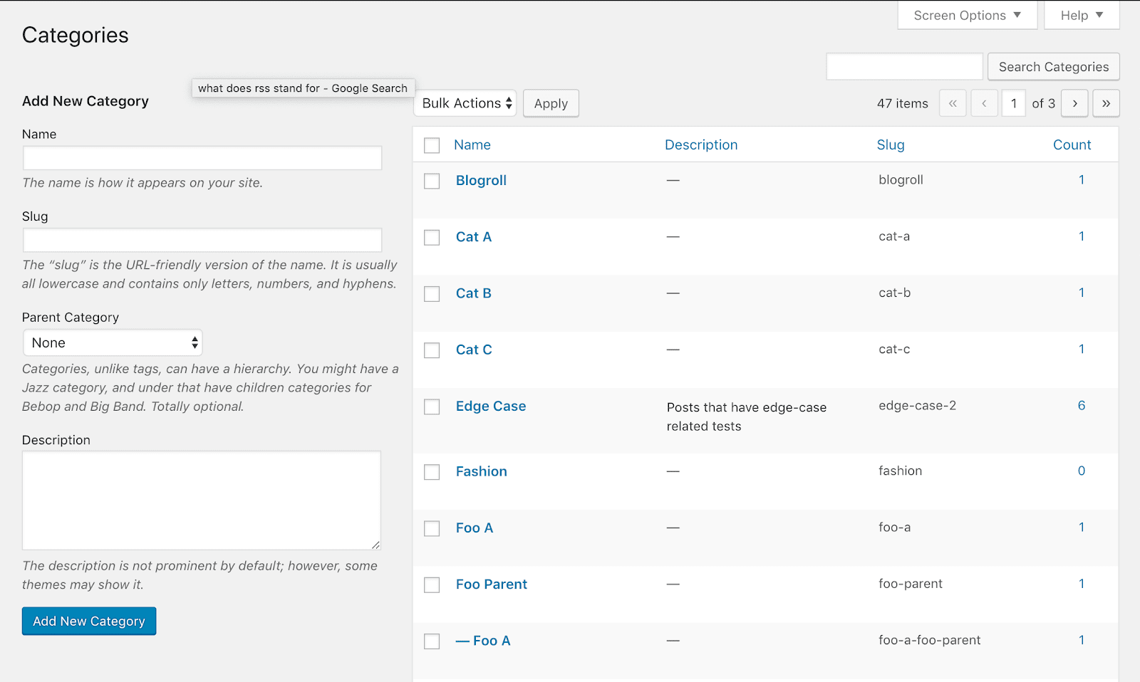 To add a new category to your site, navigate to Posts > Categories and create one. This screenshot shows some example categories we created: