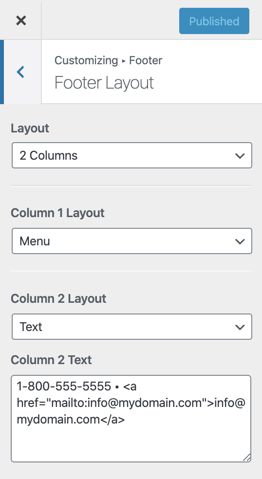 Let’s say you chose the footer to display a particular menu in the Beaver Builder Theme. Then you’d go to Appearance > Customize > Footer > Footer Layout to specify where in the footer to place the menu. In this example, two columns are specified for the footer, and Menu is chosen for the left column: