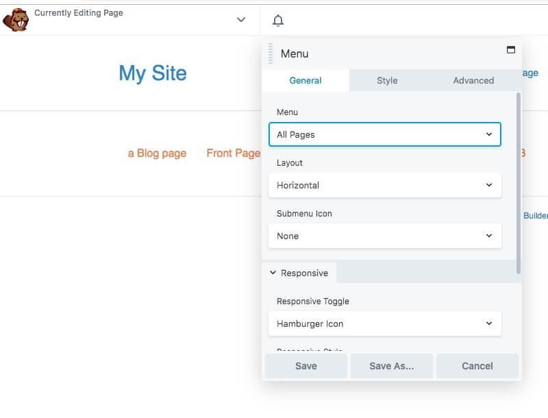 Just drag and drop the Menu module onto your page in the Beaver Builder editor and the settings window will appear, where you can select which menu to use and select responsive and style options: