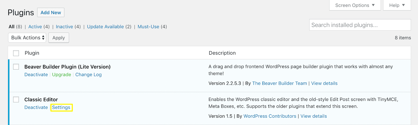 - Plugins. Install, activate, and update plugins here.