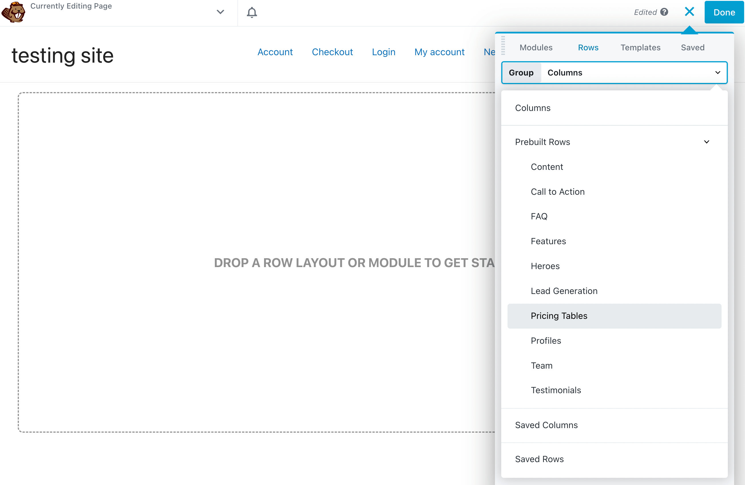 Alternatively, you may want some more variety in your pre-designed pricing table options. In this case, you can browse Beaver Builder’s pre-built rows. To get started, simply go to Rows > Prebuilt Rows > Pricing Tables: