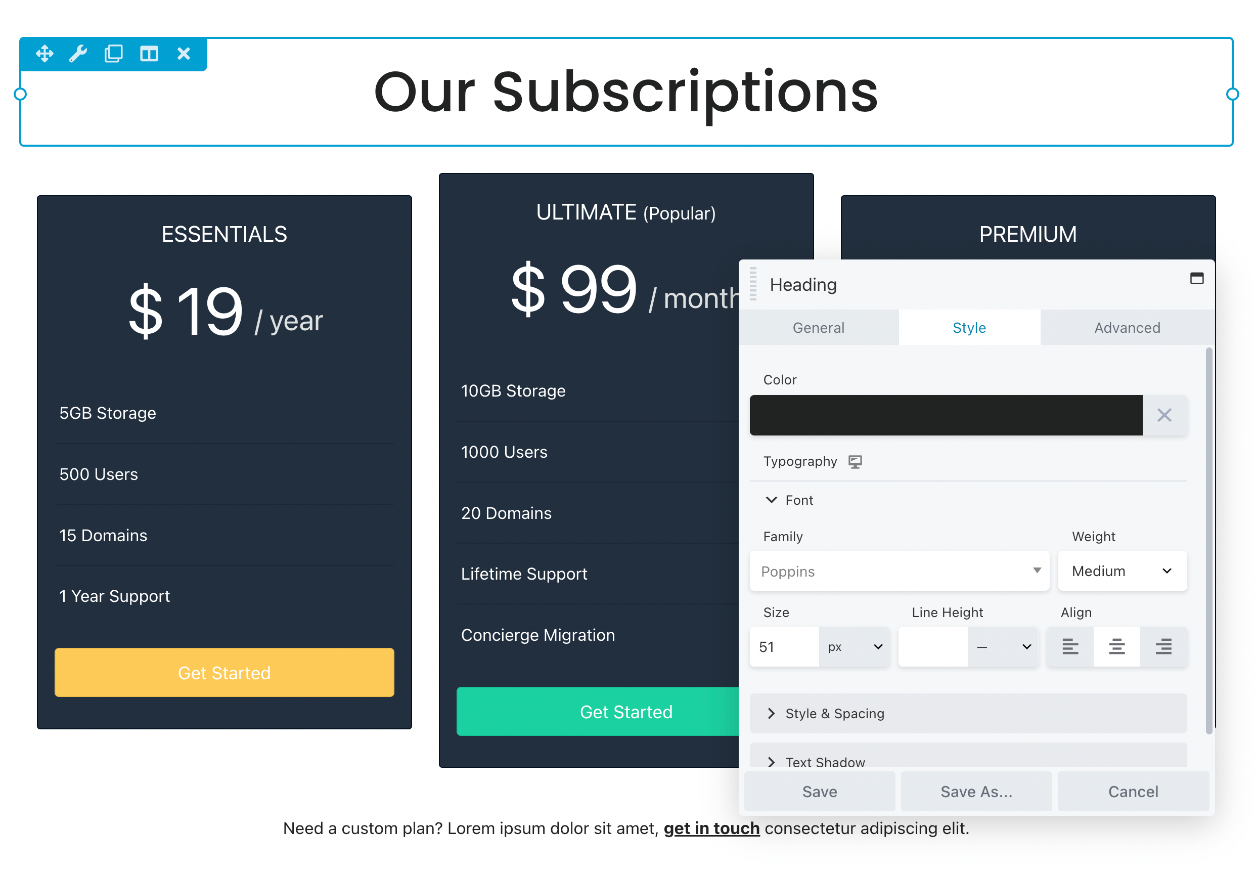 Next, you can edit the text, font, and color of the main headings. You might want to include a brief call-to-action, like Find the perfect plan for you, to encourage users to look at the table: