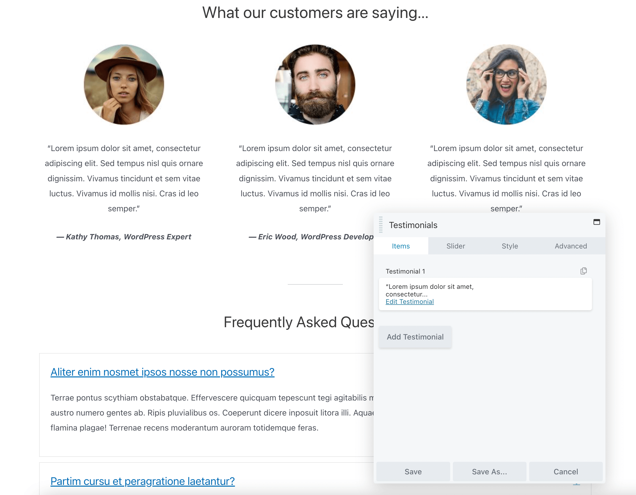 As noted above, the page template we are working with also includes a customer testimonial and FAQ module. You can choose to delete these or, after you’ve saved your pricing table, you can scroll down the page and customze these sections to include more information about your products or services: