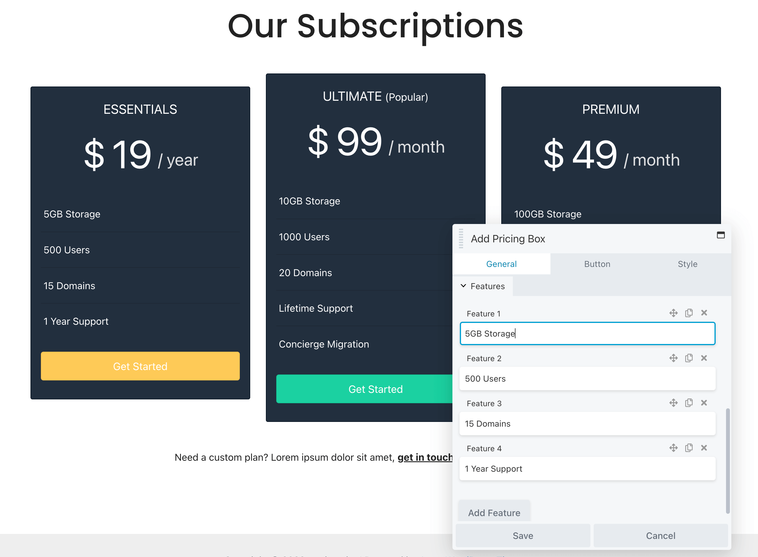 Next, scroll down to the Features section. Here, you’re able to edit the current options and add new ones as needed. To ensure that customers understand your pricing table, it’s a good idea to only include the main features that will differentiate each tier:
