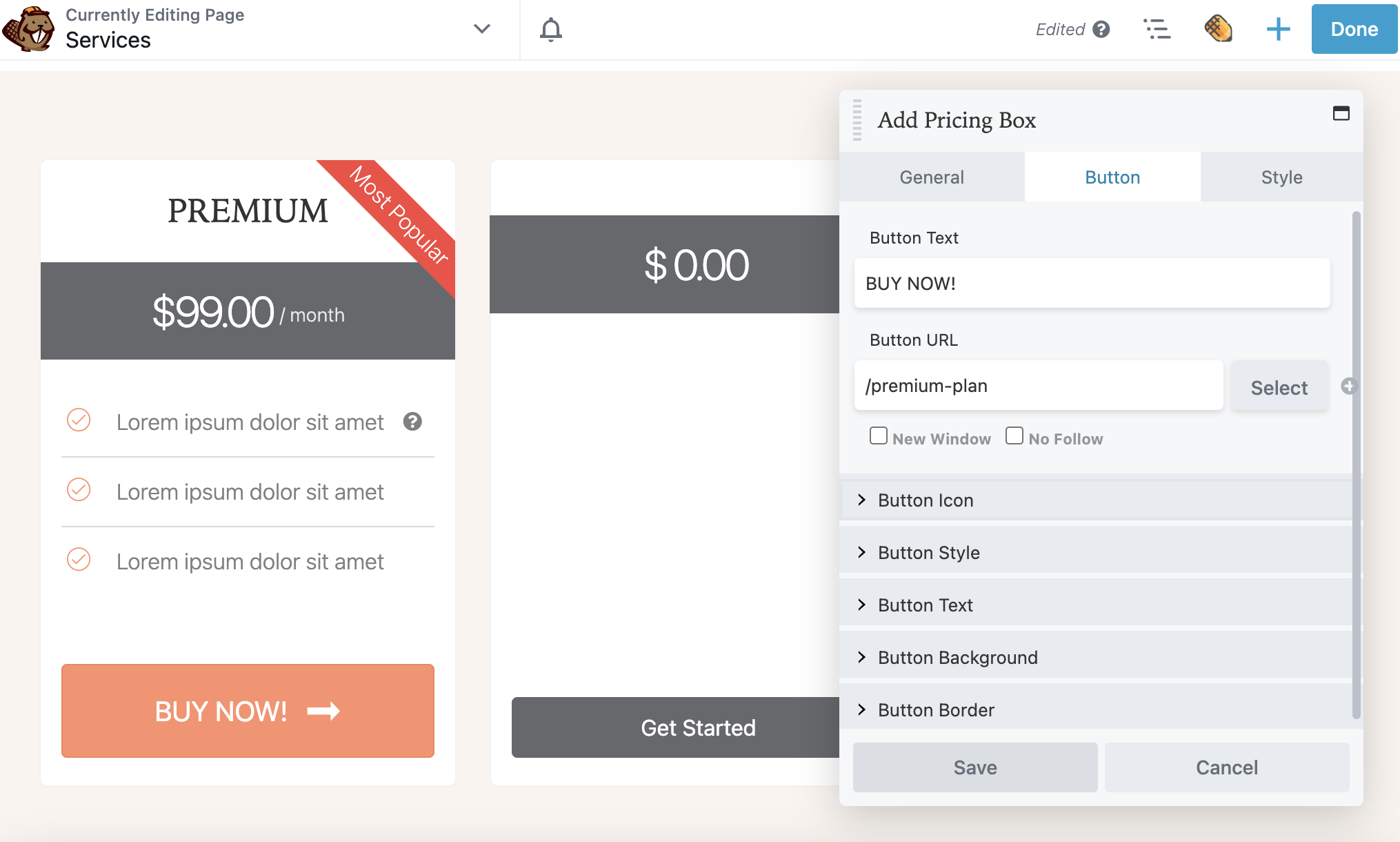Once you have finished adding the features for this pricing box, you are ready to move on to the Button tab. Here you can add a custom call-to-action with a link to your product. You might also consider including a button icon and customizing further with your brand colors: