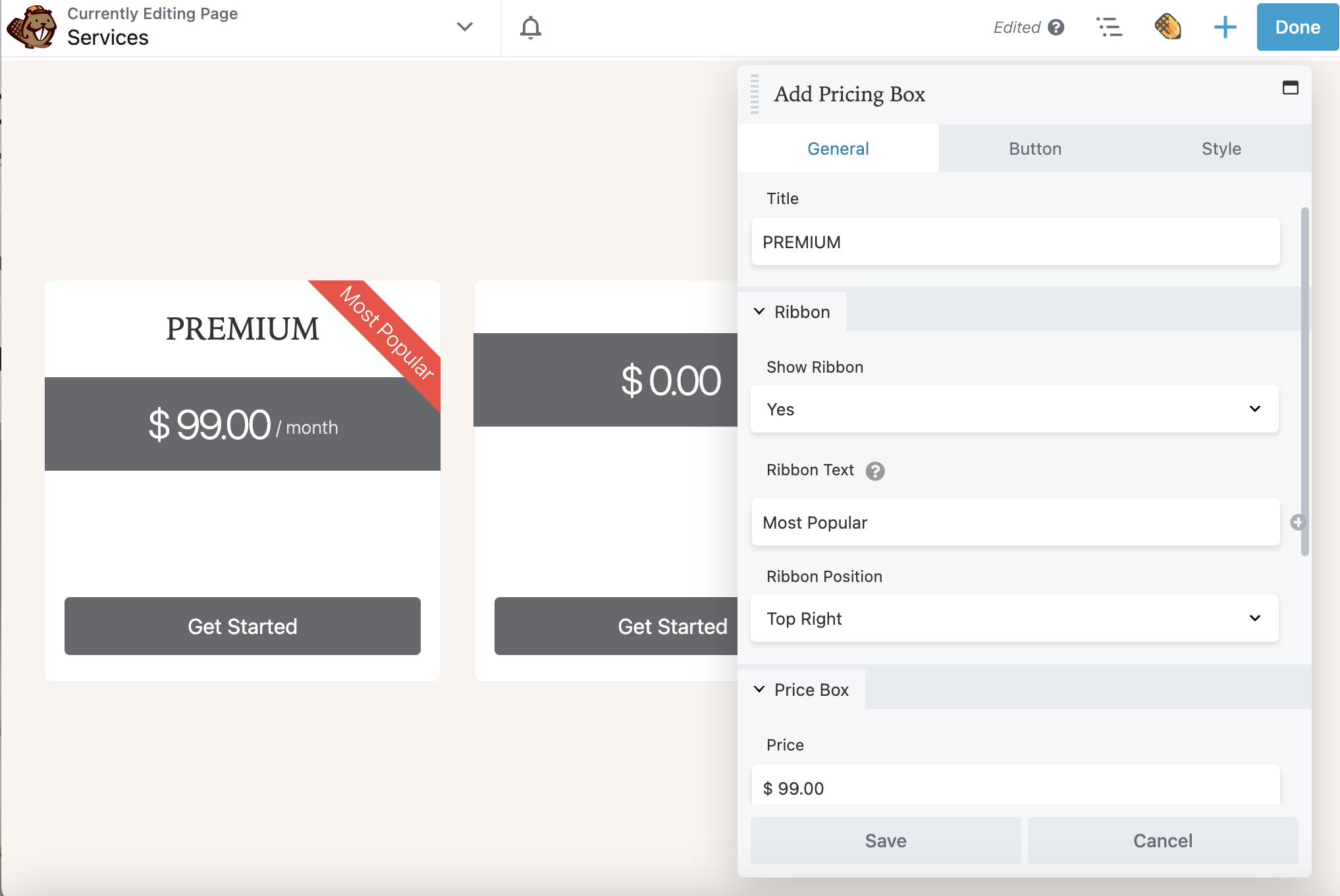 Next, select Edit Pricing Box. In the General settings, give the box a title and add a price and payment duration. You can also choose whether you wish to show a Ribbon. In this example, the ribbon is displayed on the top right of the most popular pricing option: