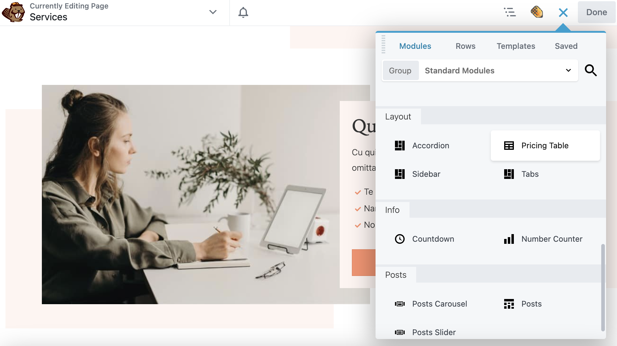 With Beaver Builder, you can add a Pricing Table module to any post or page and then customize it from the ground up. First, open the Modules tab and find the Pricing Table option. Then, you can drag and drop it anywhere: